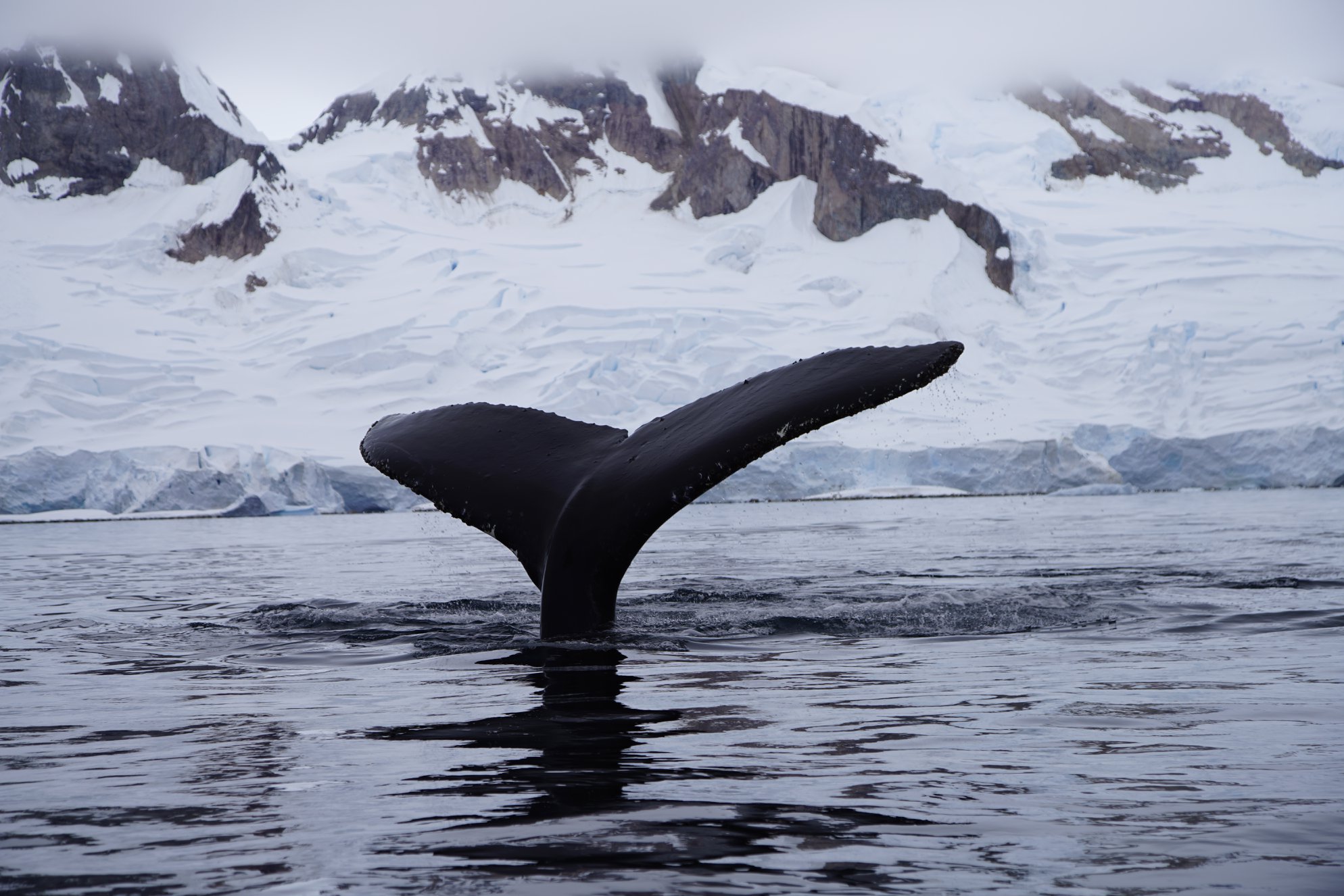 Humpback whale diving deep to feed on krill.